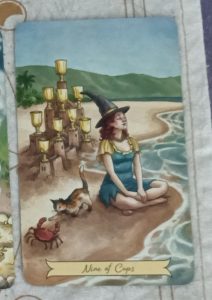 This card was in the stretch position last week, and has moved into the comfort position this week. You enjoyed the work last week; now you’re a step closer to the wish coming true! While it’s not a good idea to become smug or complacent, it is a good idea to take a deep breath and enjoy the good stuff. You’re sitting by the sea (creativity, emotion), having built a lovely sandcastle, decorated with gold cups. Your cat is playing with the crab, a symbol of flexibility and emotional depth. Take comfort in knowing that your wish is close and will soon come true.