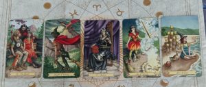 If you’re new to the weekly readings, this is a spread of mine. It’s read from left to right, 5 cards. Any card that needs more interpretation can be built into further, above and below, with either more tarot cards, another tarot deck, or an oracle deck.