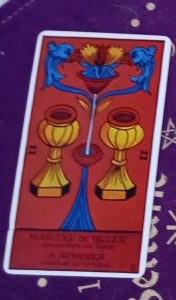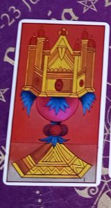 Having the Ace in conflict with the Two is interesting. It may mean that each of you from the earlier card has a different new project you want to prioritize, and you may need to discuss it and compromise. It may mean you come up with something on your own that you don’t want to share yet, or something that you want to work on as a solo project. Nurture that, but give it some time to percolate while you work on a group project. I love the colors in this card. I love the castle perched on top of the cup, encouraging big dreams. I love that the base of the cup is strong and wide enough to support the castle, so the dream won’t tip over. The dream is wonderful and meaningful. It might not be the week to act upon it, given that it’s in the challenge position. Nurture it, let it grow, but don’t let anyone talk you out of it. This card is one of my personal favorites in this deck, and I love to meditate with it.