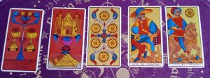 If you’re new to the weekly readings, this is a spread of mine. It’s read from left to right, 5 cards. Any card that needs more interpretation can be built into further, above and below, with either more tarot cards, another tarot deck, or an oracle deck.