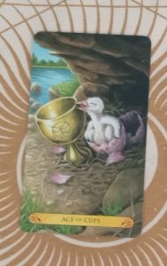 The Ace of Cups is about fresh ideas, emotions, creativity, opportunity. The little duck (or perhaps a swan) has broken out of its shell and nuzzles the cup. It’s in a sheltered space, and there’s water visible outside of the sheltered space, indicating it is safe to try something new creatively or emotionally. On a personal level, I’m happy to see this card this week; it speaks directly to a new opportunity for me. The Chariot and the Six of Wands indicate support.