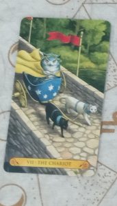 Take the reins, my friends, and take control of your own destiny. I love that the owl is in a chariot pulled by two cats, symbols of Freya, and often associated with the chariot even more than horses. You have all the elements represented here – green for earth, yellow for air, red for fire, blue for water. The stone bridge on the chariot indicates a firm foundation, and there’s a lush landscape all around. Go for it!
