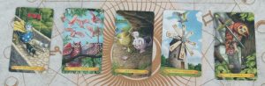 If you’re new to the weekly readings, this is a spread of mine. It’s read from left to right, 5 cards. Any card that needs more interpretation can be built into further, above and below, with either more tarot cards, another tarot deck, or an oracle deck.