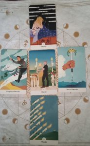 This reading is all swords and wands, so it’s about thought and identity. There’s a single court card. There are no Major Arcana cards. This reading is about the daily details. It’s about preparation, so that when the planets turn direct, you’re in a position to take action. Don’t sabotage yourself with the 9 of Swords.