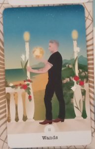 The 2 of Wands is about making a plan. We are in retrogrades that impede travel and communication and electronics (Mercury) and expansion (Jupiter). We have begun the year of the Fire Horse, and several planets have moved into Aries, so we’re feeling that impatience. But the retrogrades, and this central card tell us to plan first. You can achieve what you desire when you make a solid plan, and make a plan flexible enough to handle change. I love the colors and the flowers and the sense of proportion in the card.