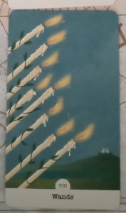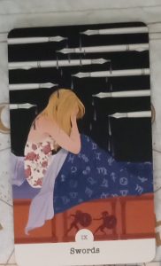 This reading is all swords and wands, so it’s about thought and identity. There’s a single court card. There are no Major Arcana cards. This reading is about the daily details. It’s about preparation, so that when the planets turn direct, you’re in a position to take action. Don’t sabotage yourself with the 9 of Swords.