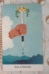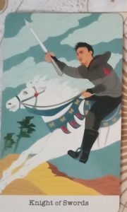 Knights are about movement, and taking something out into the world. The Knight of Swords has grit and determination, and the ability to turn on a dime, due to a quick wit. This is in the position of creativity. Once you make a plan, deal with your anxiety, create your new ideas, and things start moving, you can ride that flow. Just be ready to change quickly, and don’t let the 9 of Swords impede you. A knight of intellect holding a fountain pen as he charges off is a great card in this position for a writer, in my opinion. Just don’t launch before you’ve made a plan!