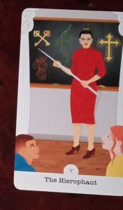 In many decks, the Hierophant is depicted as a religious figure. In this deck, the figure is a teacher, although there are symbols with various spiritual significance on the board behind her. She wears red, the blackboard is black, and the pillars frame her are white. White, black, and red together are important spiritual colors, especially in magical traditions. While there is no sunlight, there is yellow in several of the symbols, tying back to the Sun card. Her students look interested and a little intimidated. To me, in this card in this position in this week, it means a time to listen to those with more experience (or different experience) than you have. There is useful information that you might reflexively disregard, but if you listen and pay attention to the deeper layers, you will find something of value.