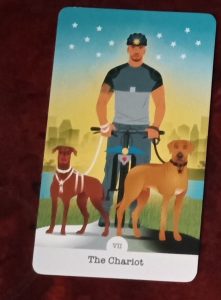 The Chariot is about taking charge of your own direction in life. In the position of the west/emotions, it’s about deciding where to put your emotions and your creative energy. Which direction flows best for you? You’re out with your pack (the dogs). Who leads this week? The card suggests you should leave and the dogs will travel with you, rather than pulling you in a specific direction. There are stars in the sky, and the yellow is low to the ground, suggesting a setting sun. The sunlight starts high in the center, and moves lower as we come around the wheel this week, which is kind of beautiful.
