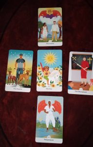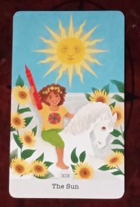 The Sun card is about joyful success. I love that the figure in the card rides a horse brandishing a red crayon! Ride this week with joy and optimism, and there’s success involved. This card was in the East/Intellect in our March 9 reading, but this week, it’s the central energy of ourselves. Let’s enjoy it and use it. It’s been a tough winter physically in my neck of the woods, and a tough winter on every level all over the place, so let’s harness this energy and use it to make improvements this week.