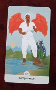 This card is about both balance and flow. The figure stands with one foot in the water and one on land, pouring from his pitcher to his glass. There’s a clump of iris, symbolizing wisdom and hope. In the background is a sun between mountains, again tying back to the Sun card. Keep on keeping on, keep hope, keep balance. Because it is in the position of passion and identity, it also ties into what I said at the top of the reading about the need to balance your boundaries with the good of the community, and how they are not mutually exclusive. We have been conditioned to believe our lives are either/or – sacrifice yourself or be considered selfish. The truth is when we all work to care for both ourselves and others, everyone benefits and the society grows stronger. Systemic oppression hates this, and does everything it can to make us believe what they want and will profit from, not what is best for the greater good. This week, flow without complying.